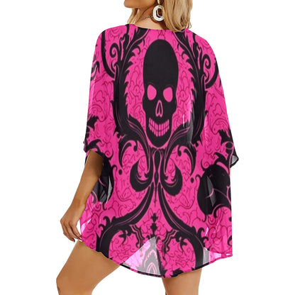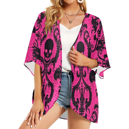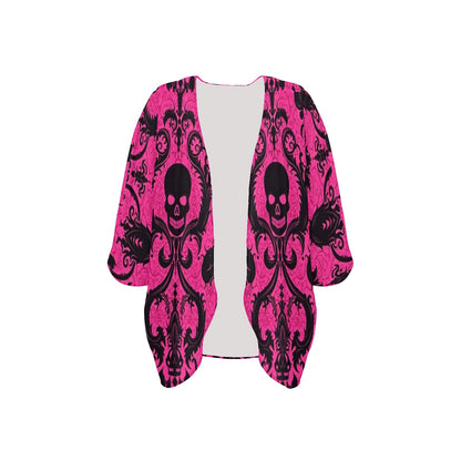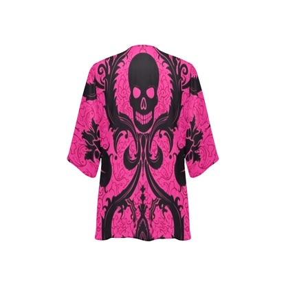 Black Skulls On Pink Kimono Chiffon Cover Up