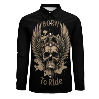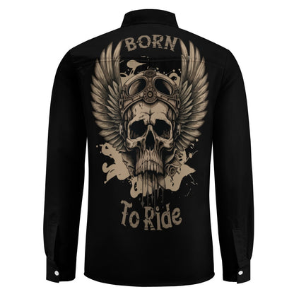 This casual one pocket long sleeve shirt features the saying born to ride with a skull design