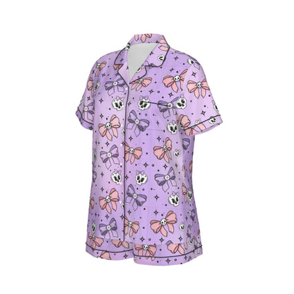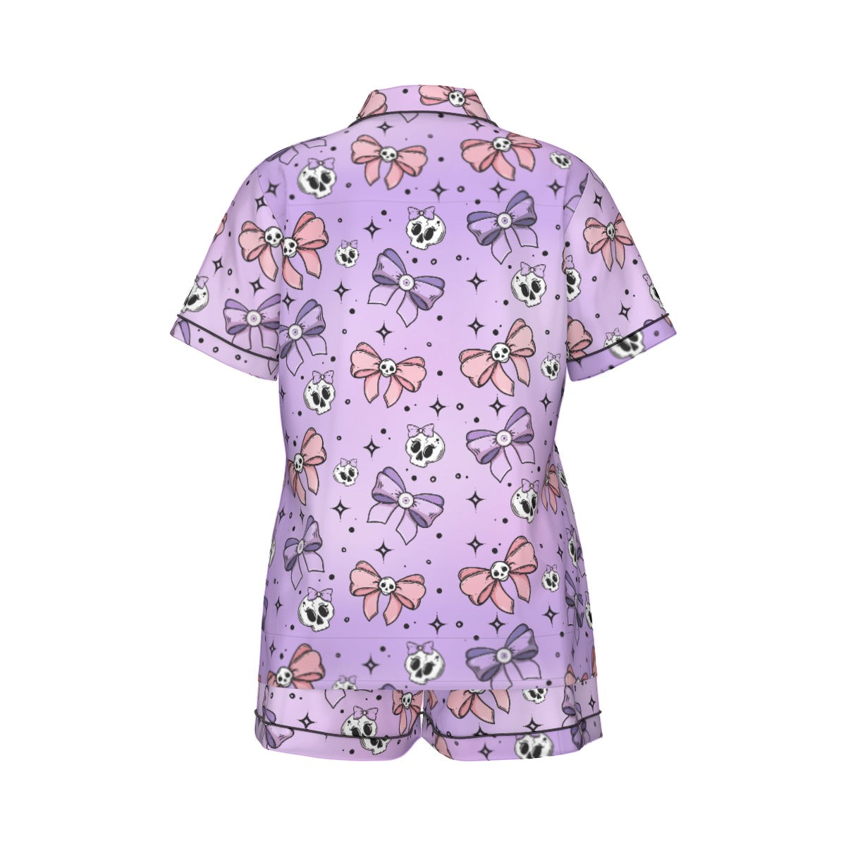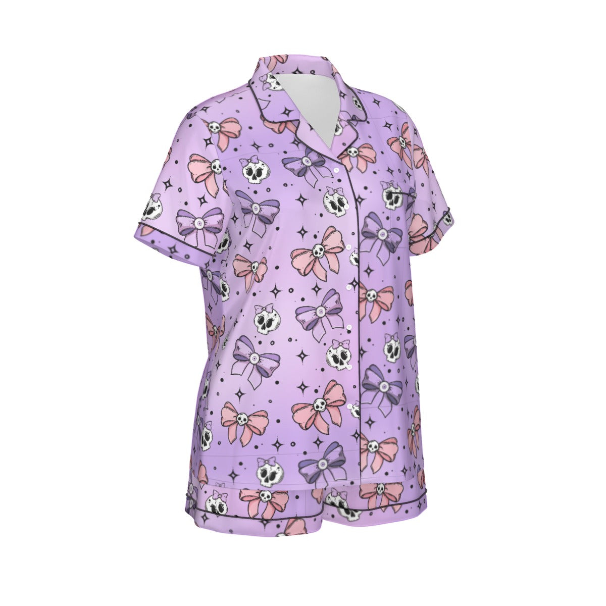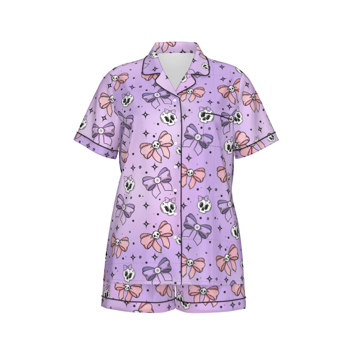 Cute Skull And Bow Imitation Silk Pajama Set With Short Sleeve