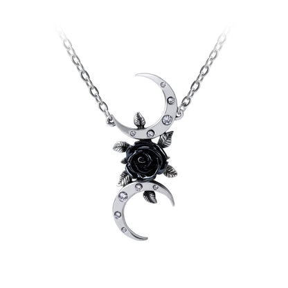 An alternative allegory for the Triple Moon Goddess, seen from a romantically oblique perspective, with a black rose 'moon' and tangential, crystal studded crescents to celebrate the mysticism of Wicca.