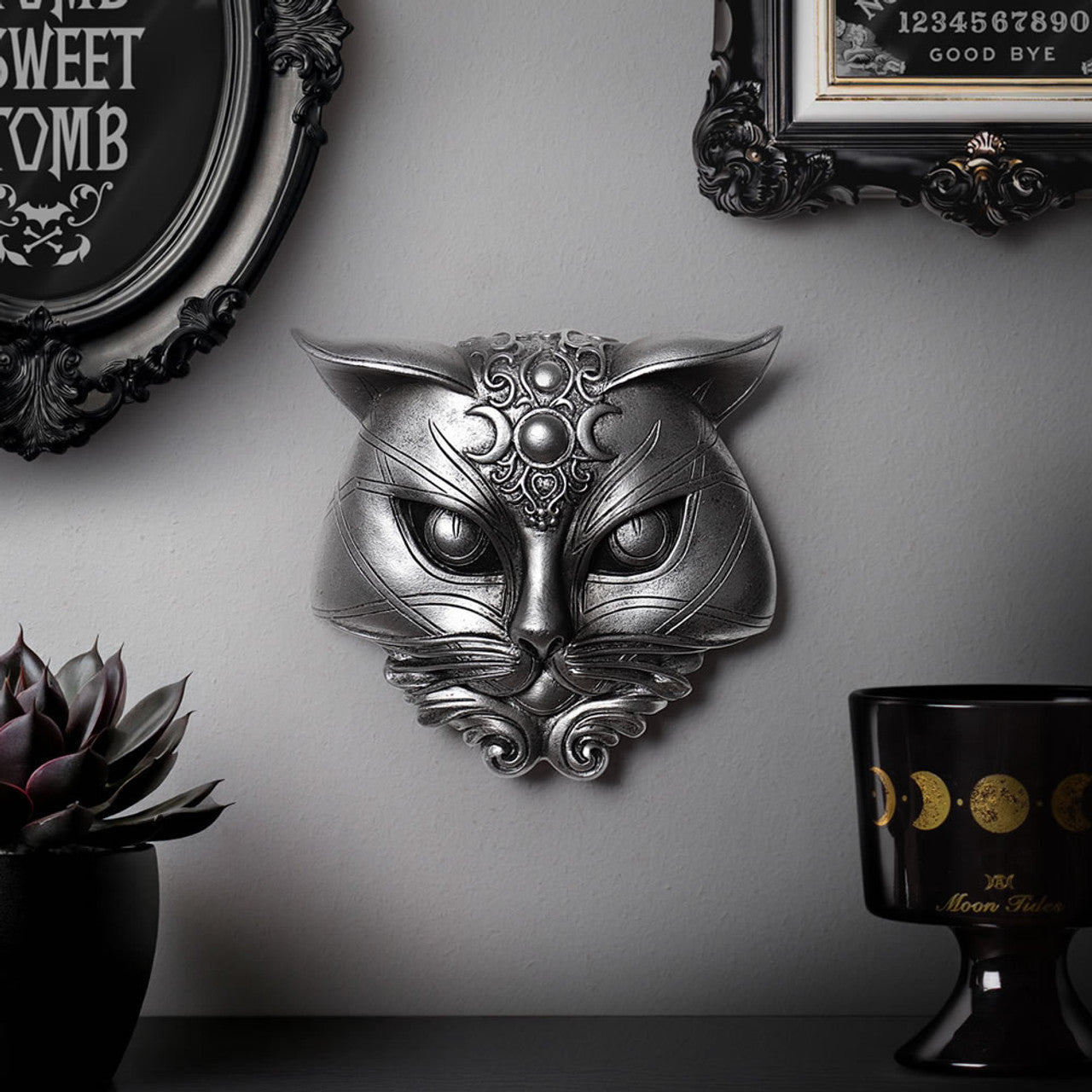 Discover the mystical allure of Alchemy's iconic Sacred Cat Face, a stunning metallic ornament that beautifully embodies the essence of feline grace and spiritual symbolism. This captivating piece features a striking triple moon design at the center of its forehead, representing the cycles of life, intuition, and the divine feminine.