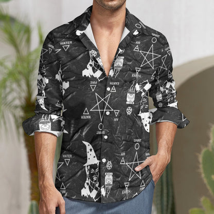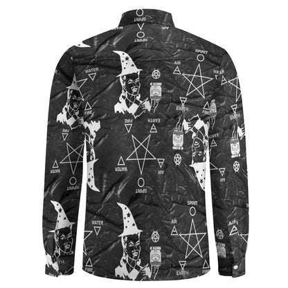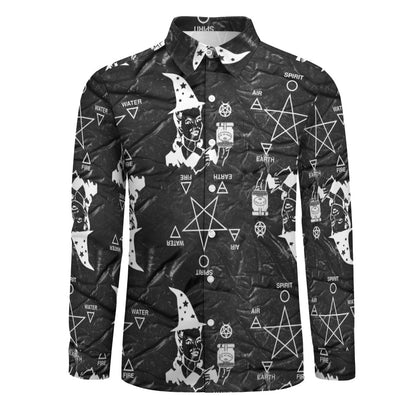 This casual one pocket long sleeve shirt features a pattern of various gothic and wizard symbols